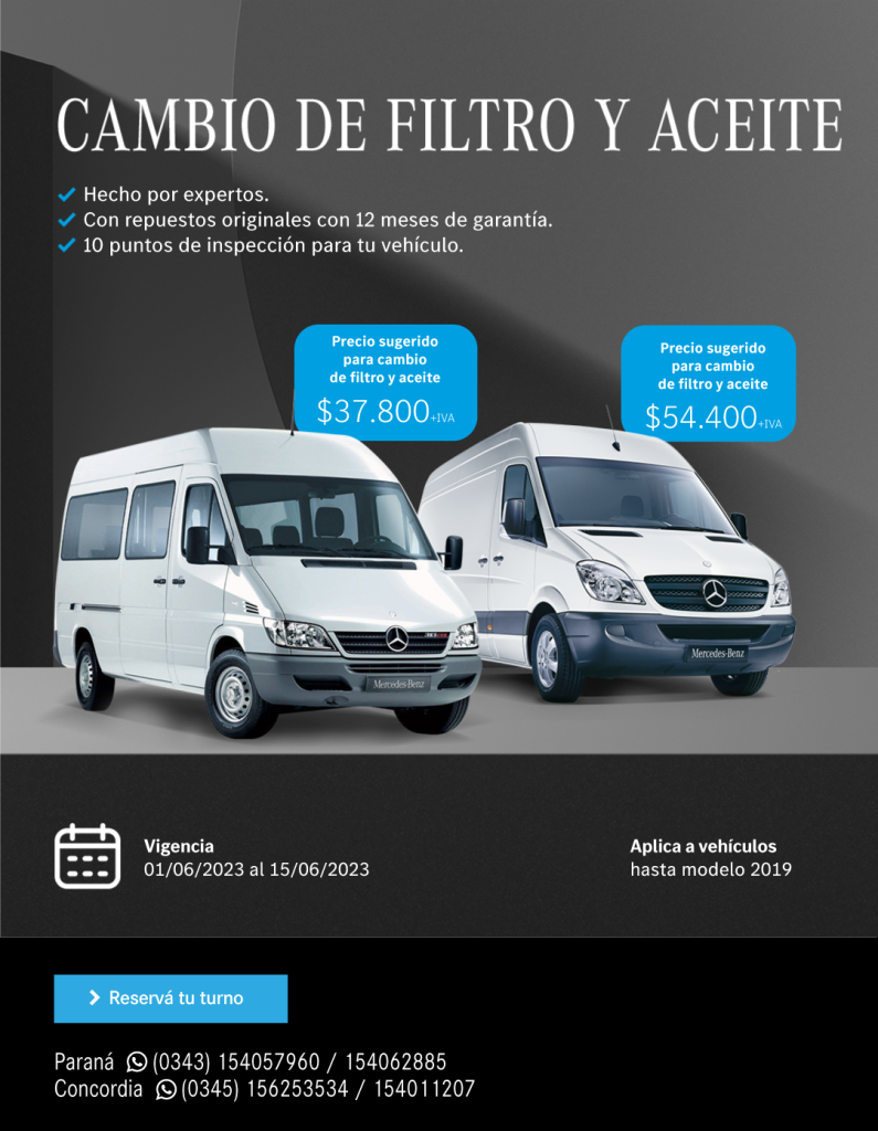 Bases y Condiciones: Oferta válida en la República Argentina para la compra del Filtro de Aceite de motor y Aceite de motor únicamente para las unidades de los modelos Sprinter marca Mercedes Benz adquiridas en concesionarios oficiales entre los años 2011 y 2019 (ambos inclusive). Si compraste tu Sprinter antes del 2011 (inclusive), el precio es de: $37.800. y si la compraste entre los años 2012 y 2019, el precio es de: $54.400. Incluye mano de obra y 10 puntos de revisión del vehículo (verificar filtro aire, verificar filtro de habitáculo, verificar pastillas de frenos, verificar amortiguadores, verificar escobillas, verificar luces, verificar niveles, verificar perdidas de fluidos, verificar neumáticos, verificar freno de estacionamiento). Estos cambios son distintos del Service Care o Express Service y no sustituyen el Service oficial de Mercedes-Benz. Para más información consulte en:https://automotoresmega.com.ar/. Oferente: AUTOMOTORESMEGA S.A., AV. ALMAFUERTE 145, CUIT 30-57487517-6. Origen de los productos: Alemania y Argentina.
